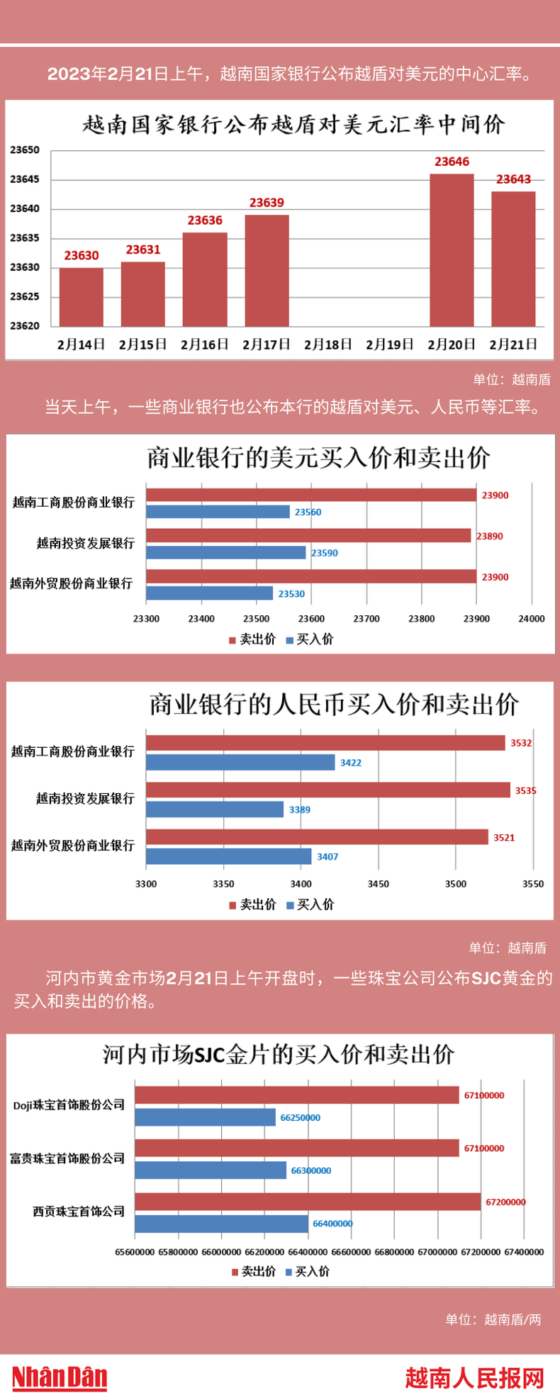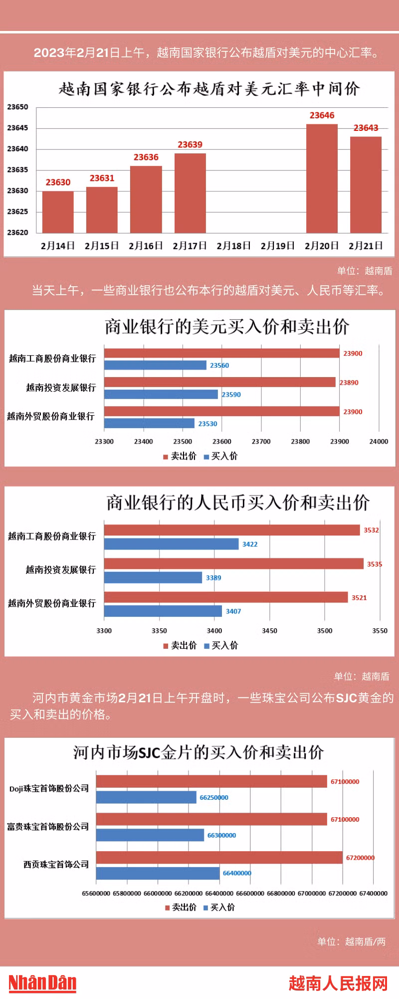 2023年2月21日上午,越南国家银行所公布的越盾对美元的中心汇率为23643。