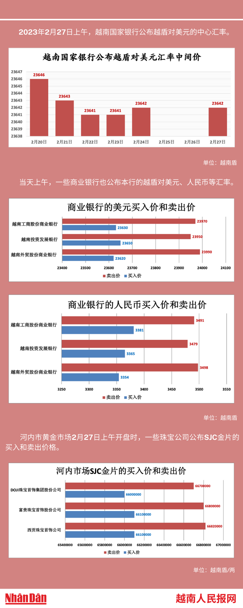 2023年2月27日上午,越南国家银行所公布的越盾对美元的中心汇率为23642。