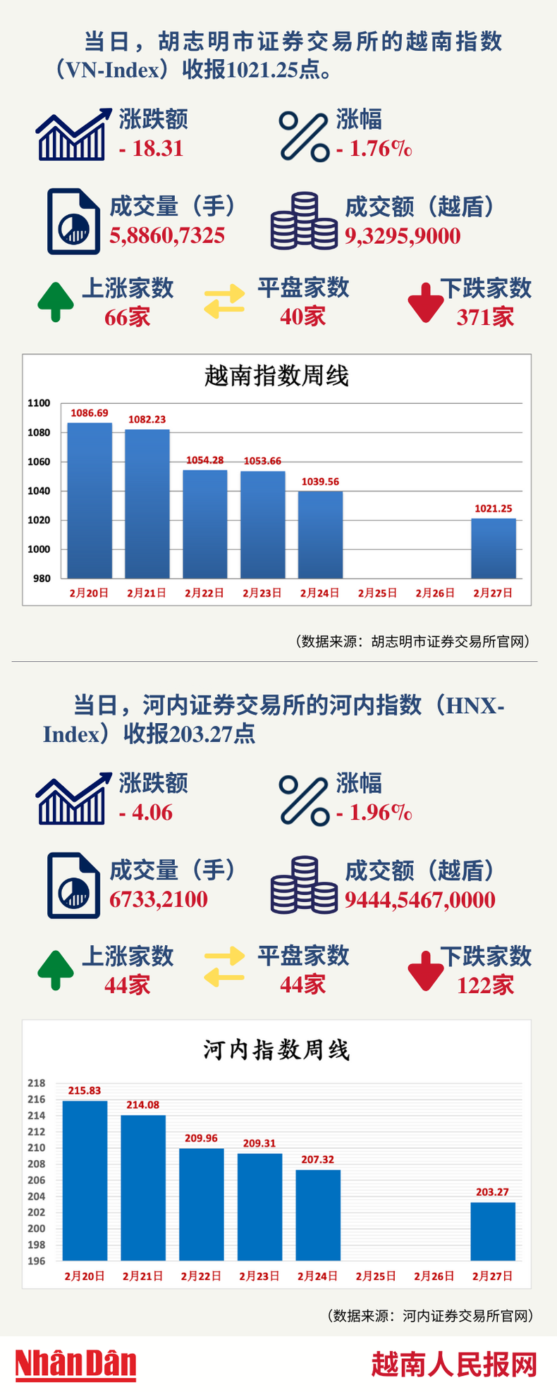 当天,胡志明市证券交易所的越南指数(VN-Index)和河内证券交易所的河内指数(HNX-Index)分别收报1021.25点和203.27点。