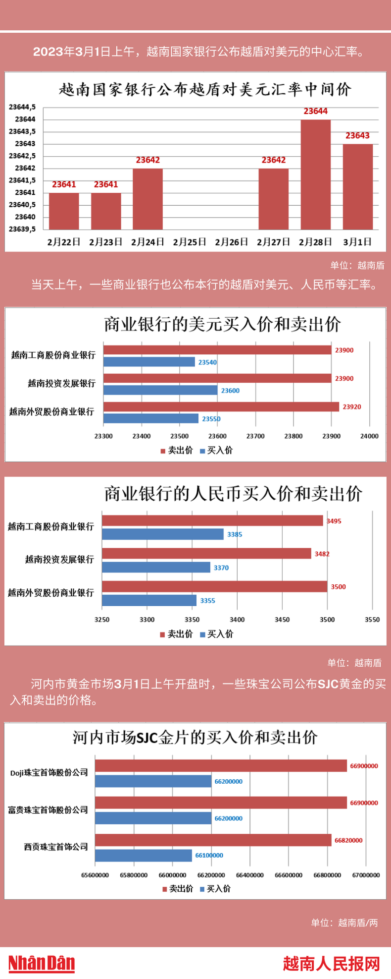 2023年3月1日上午,越南国家银行所公布的越盾对美元的中心汇率为23643。