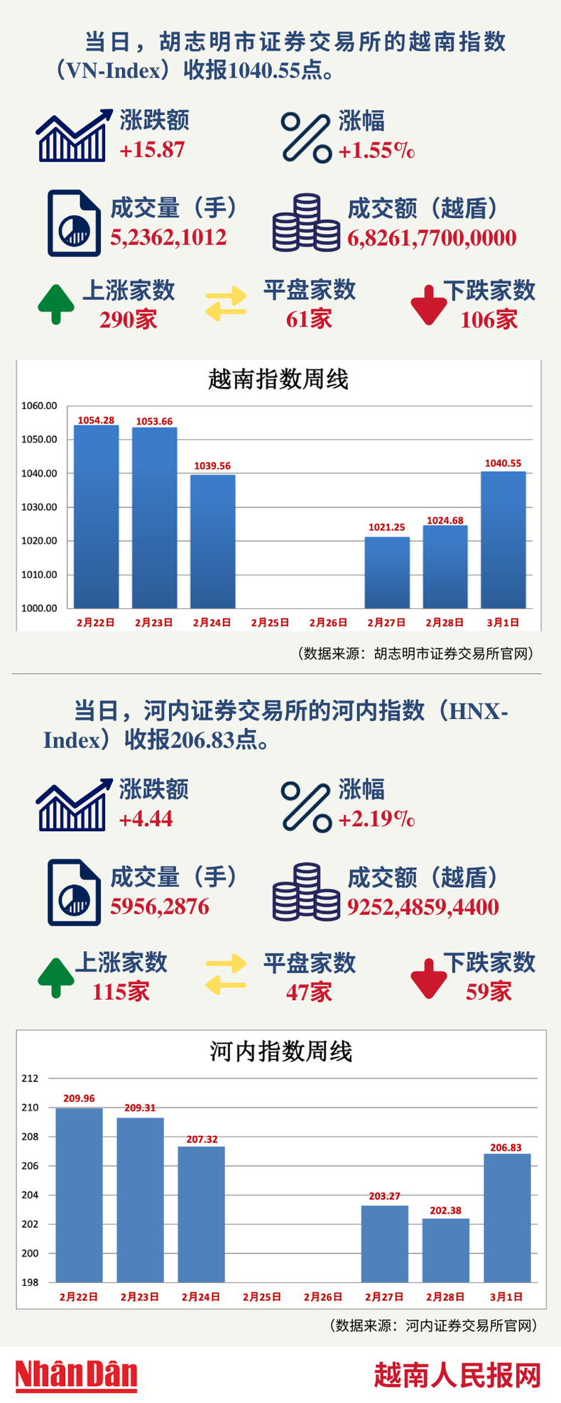 当天,胡志明市证券交易所的越南指数(VN-Index)和河内证券交易所的河内指数(HNX-Index)分别收报1040.55点和206.83点。