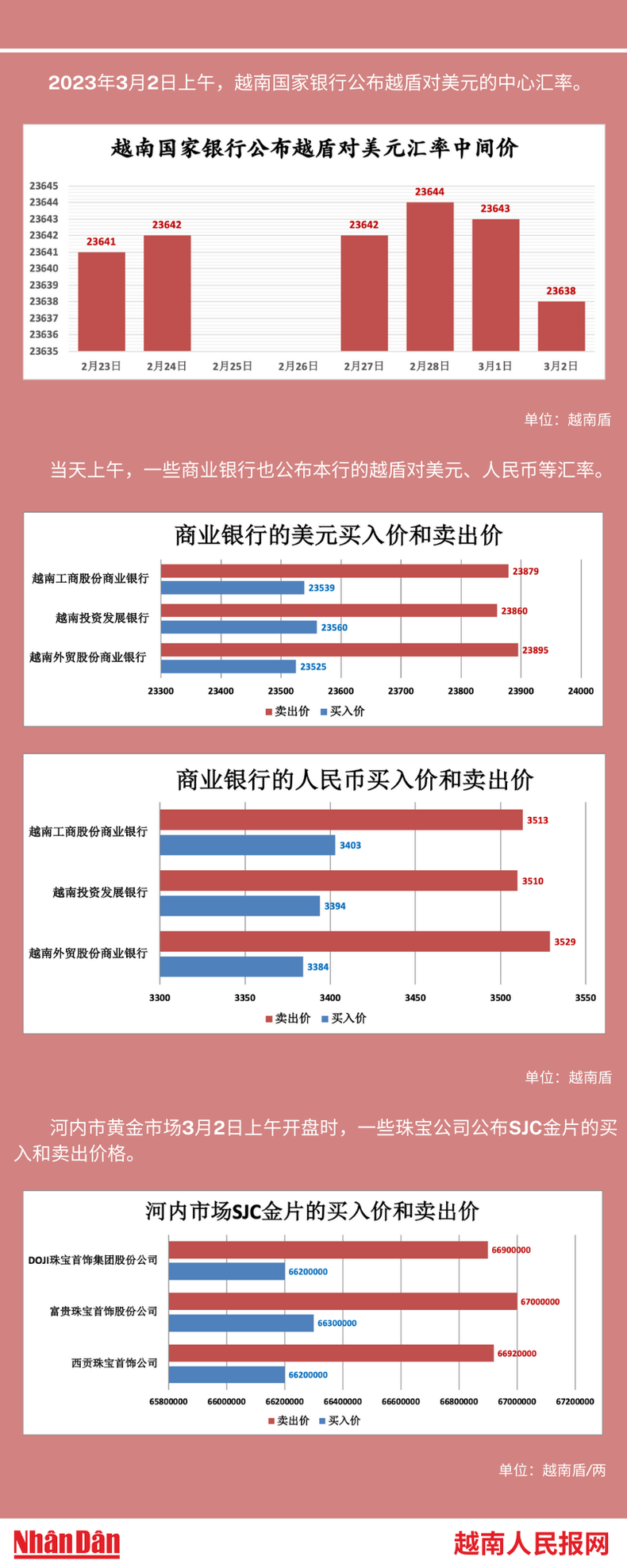 2023年3月2日上午,越南国家银行所公布的越盾对美元的中心汇率为23638。