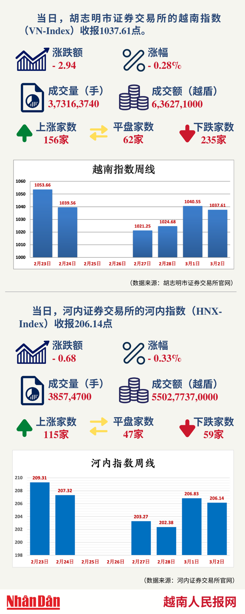 当天,胡志明市证券交易所的越南指数(VN-Index)和河内证券交易所的河内指数(HNX-Index)分别收报1037.61点和206.14点。