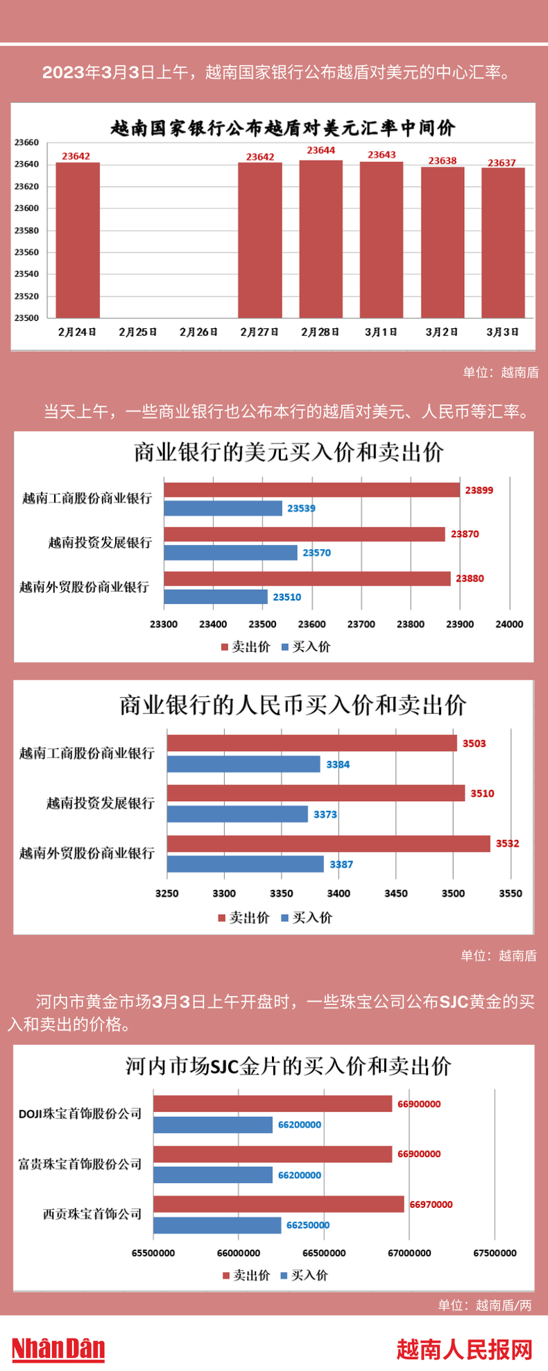 2023年3月3日上午,越南国家银行所公布的越盾对美元的中心汇率为23637。
