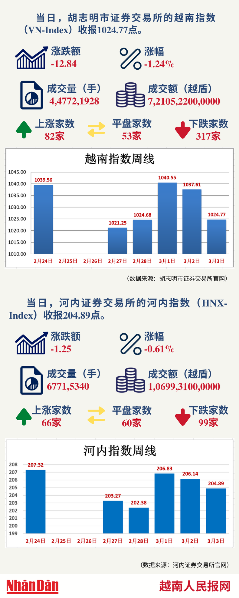 当天,胡志明市证券交易所的越南指数(VN-Index)和河内证券交易所的河内指数(HNX-Index)分别收报1024.77点和204.89点。