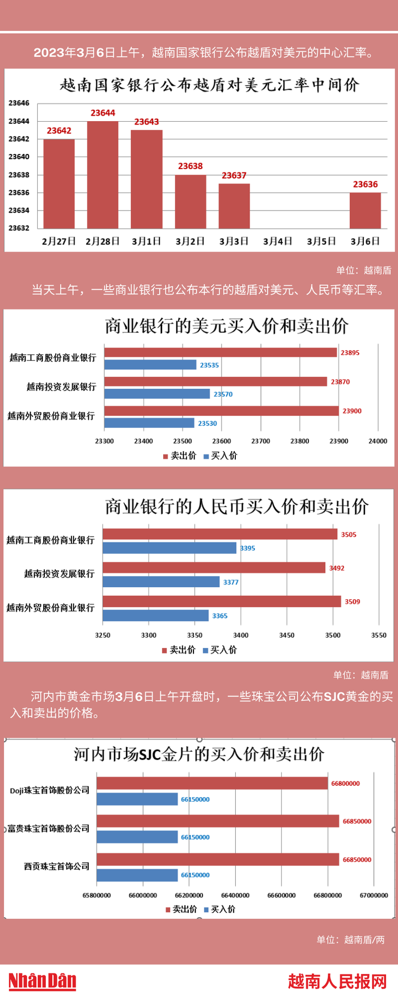 2023年3月6日上午,越南国家银行所公布的越盾对美元的中心汇率为23636。