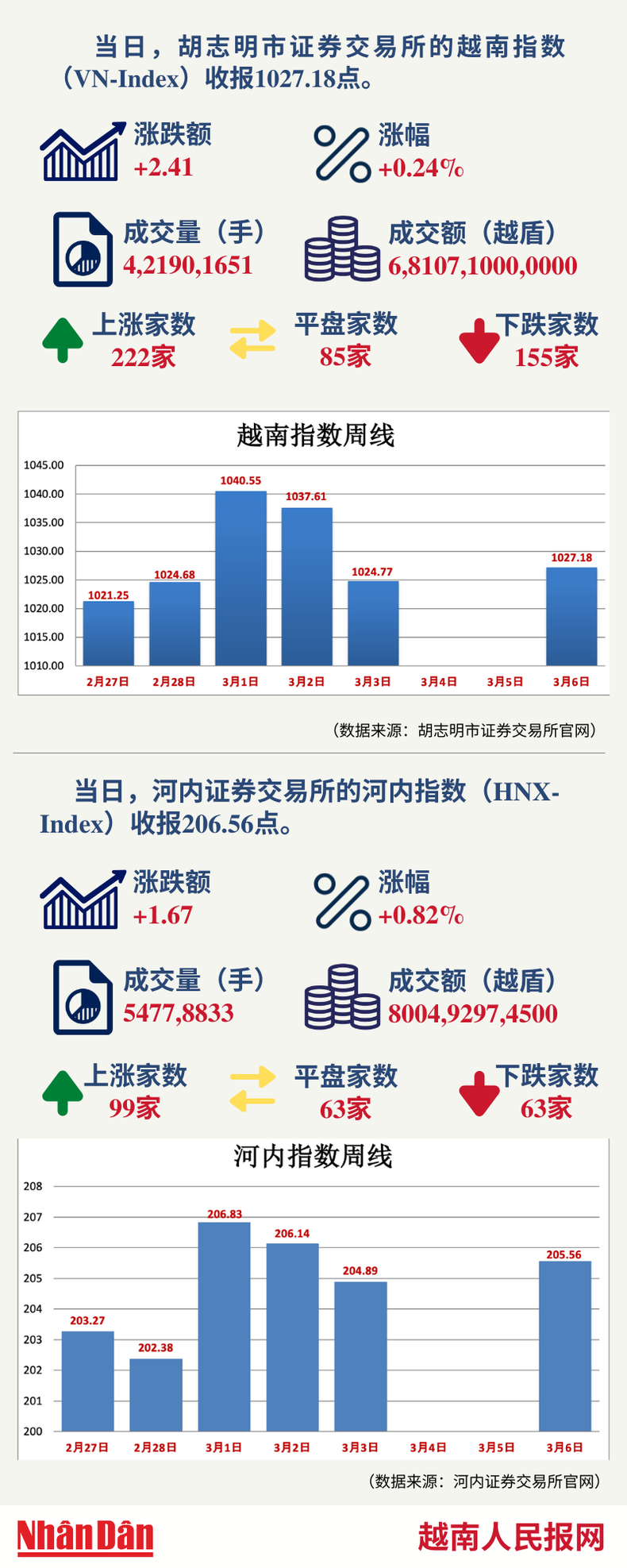 当天,胡志明市证券交易所的越南指数(VN-Index)和河内证券交易所的河内指数(HNX-Index)分别收报1027.18点和206.56点。