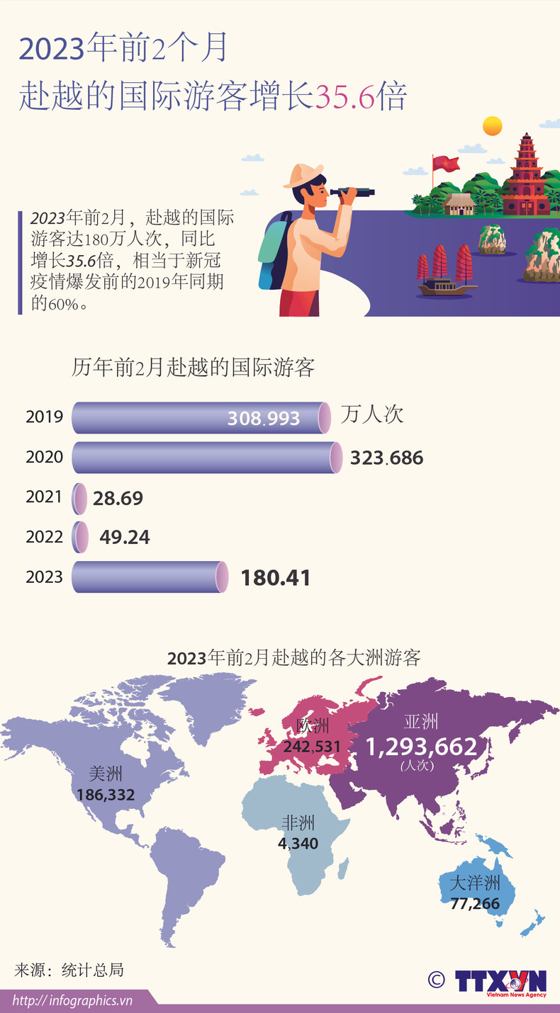 2023年前2个月赴越的国际游客同比增长35.6倍【图表新闻】
