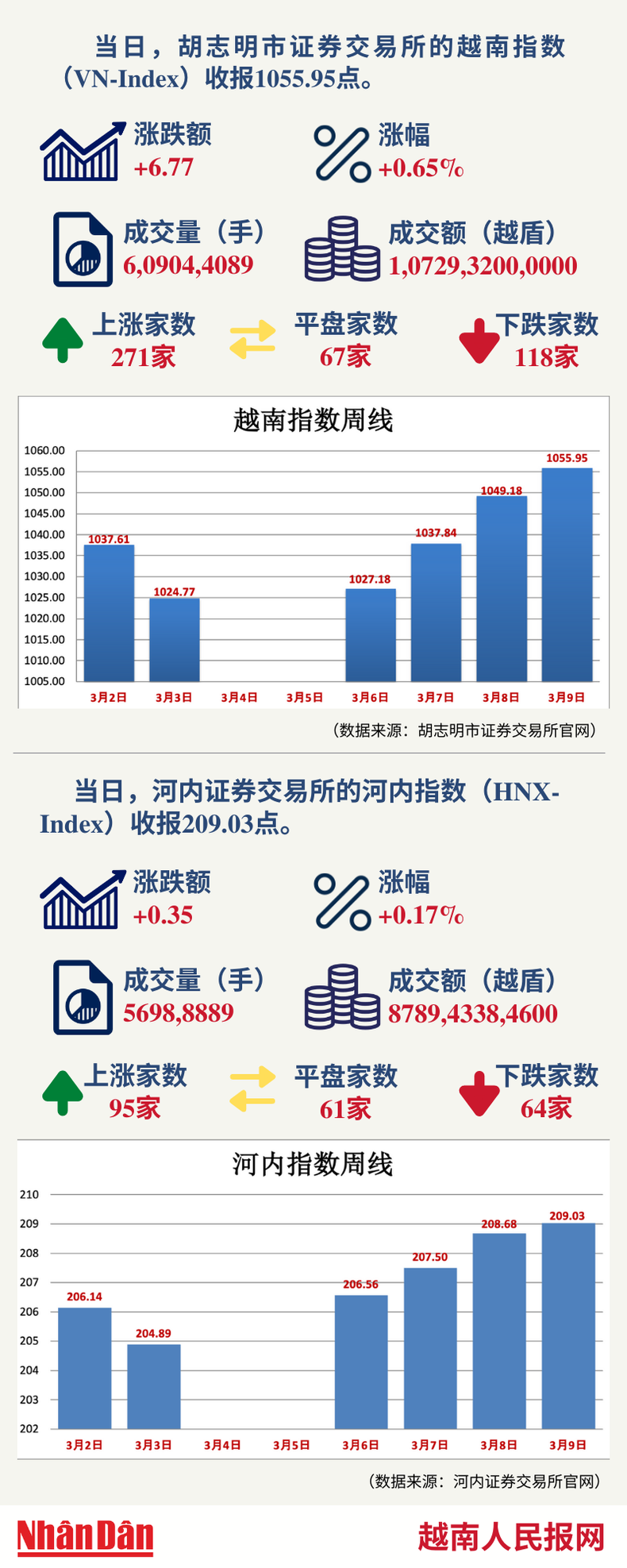 当天,胡志明市证券交易所的越南指数(VN-Index)和河内证券交易所的河内指数(HNX-Index)分别收报1055.95点和209.03点。