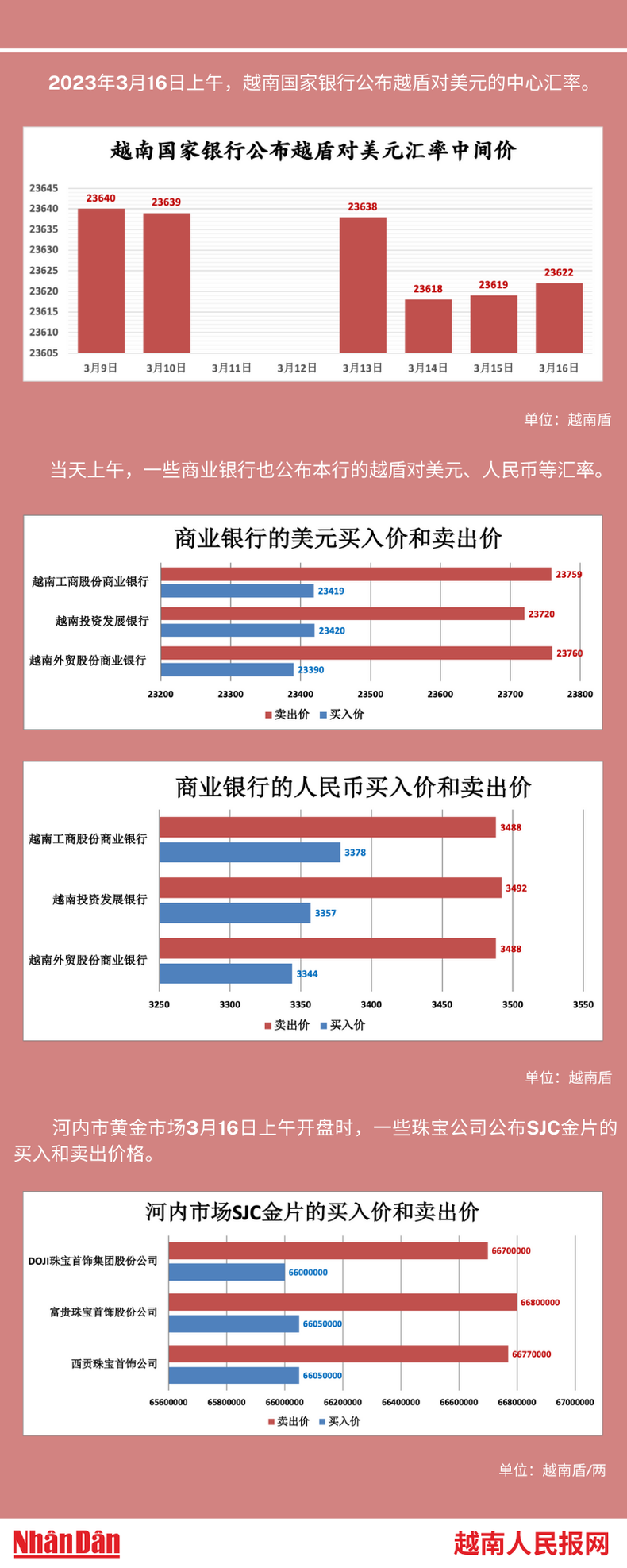 2023年3月16日上午,越南国家银行所公布的越盾对美元的中心汇率为23622。