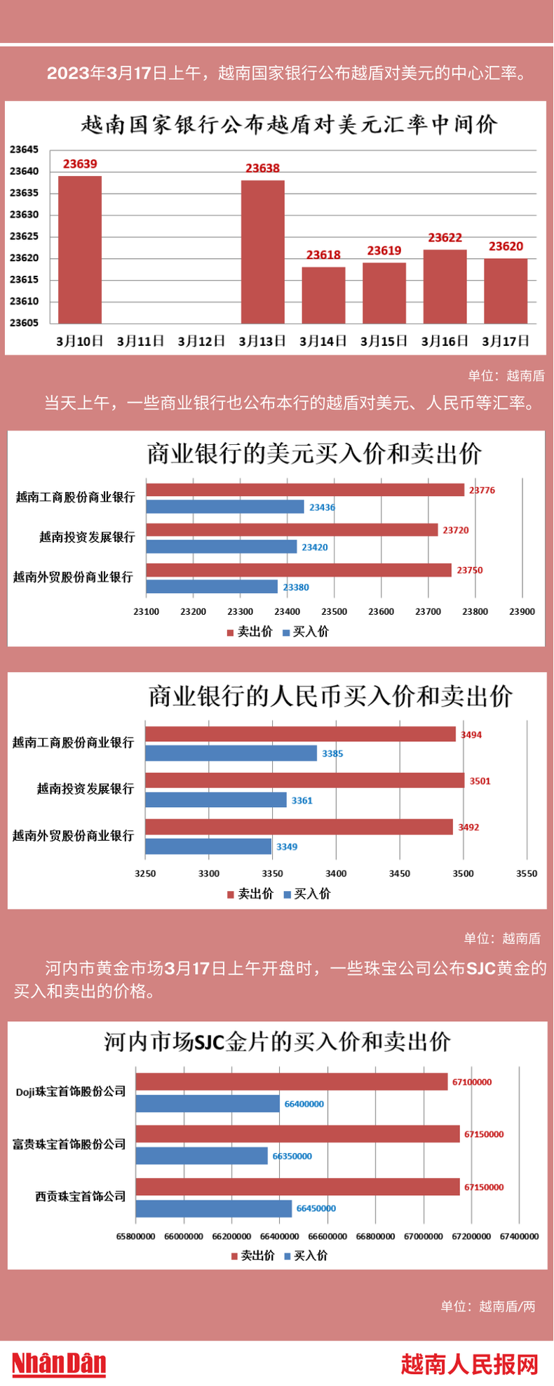 2023年3月17日上午,越南国家银行所公布的越盾对美元的中心汇率为23620。