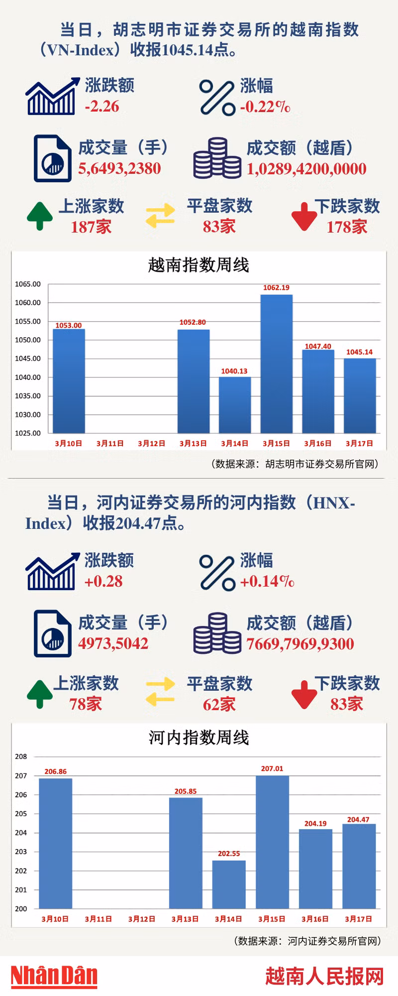 当天,胡志明市证券交易所的越南指数(VN-Index)和河内证券交易所的河内指数(HNX-Index)分别收报1045.14点和204.47点。