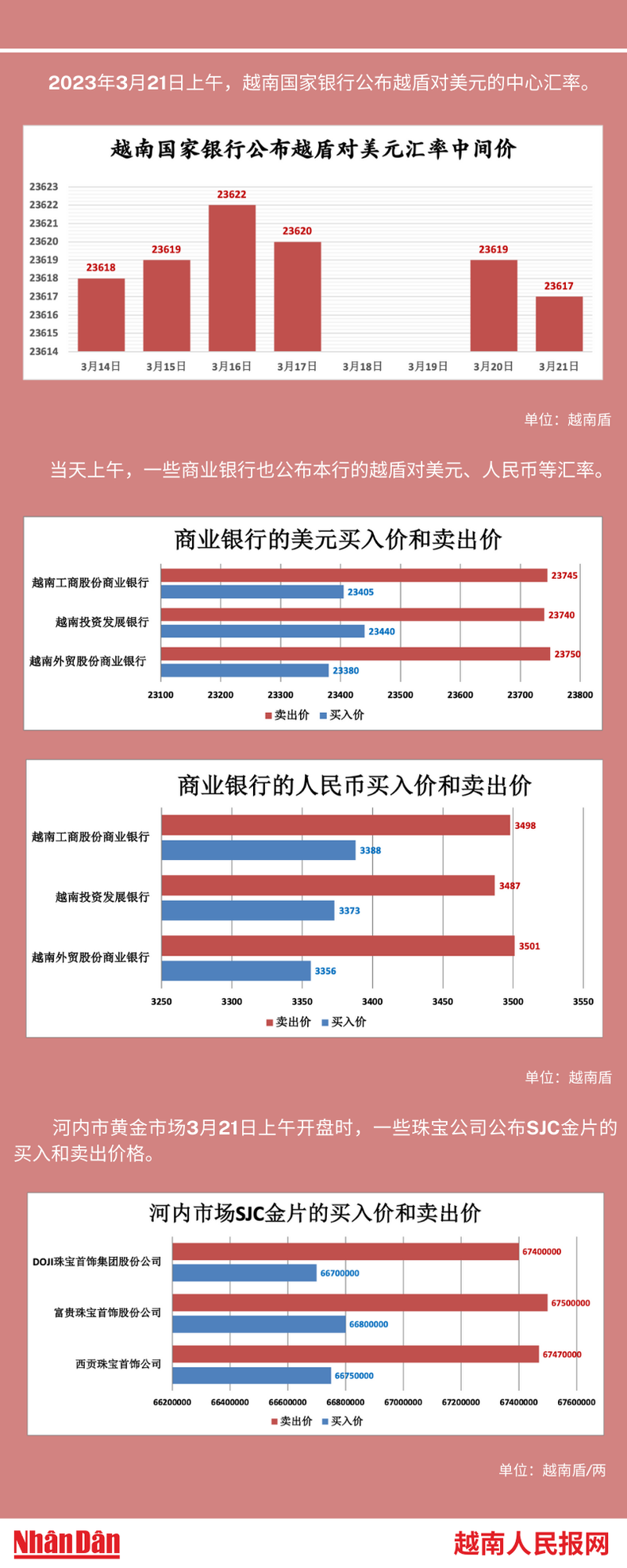 2023年3月21日上午,越南国家银行所公布的越盾对美元的中心汇率为23617。