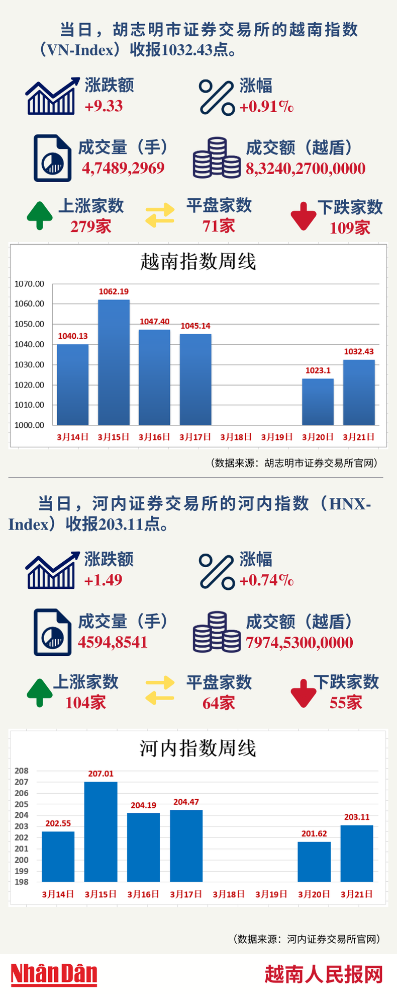 当天,胡志明市证券交易所的越南指数(VN-Index)和河内证券交易所的河内指数(HNX-Index)分别收报1032.43点和203.11点。