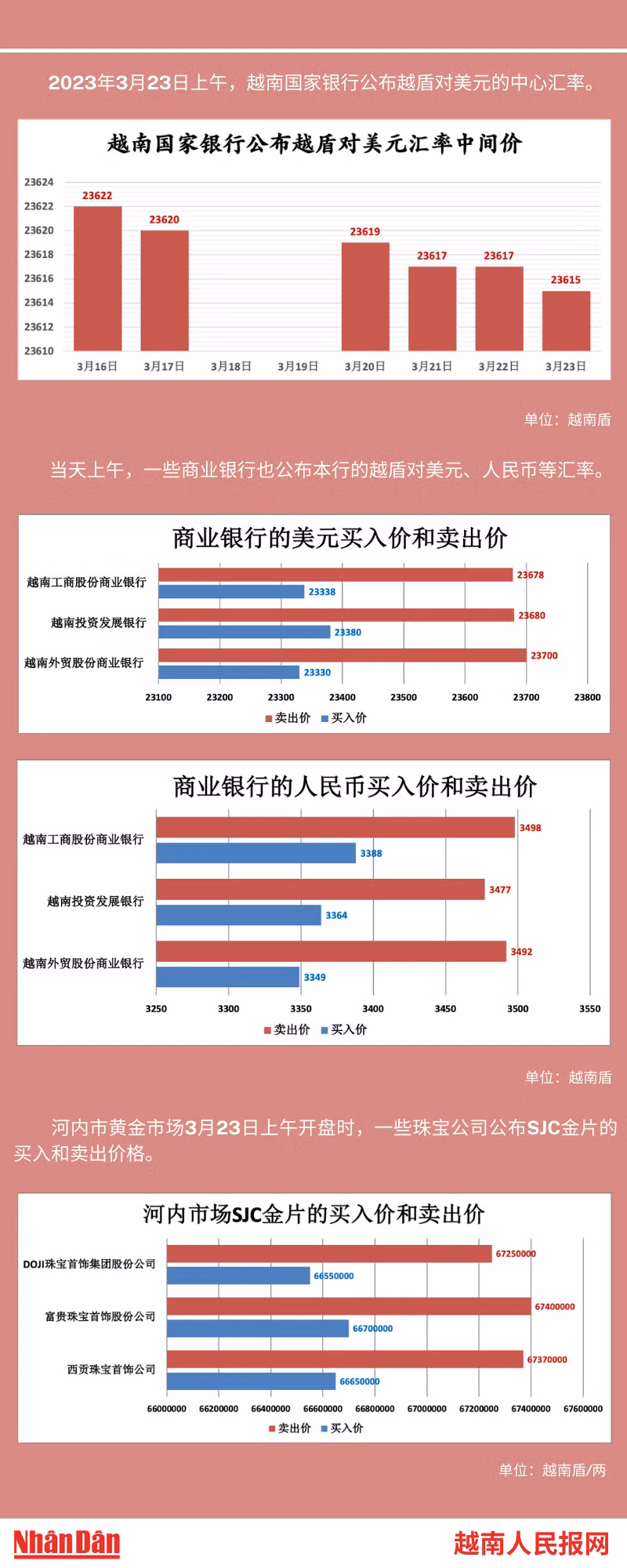 2023年3月23日上午,越南国家银行所公布的越盾对美元的中心汇率为23615。