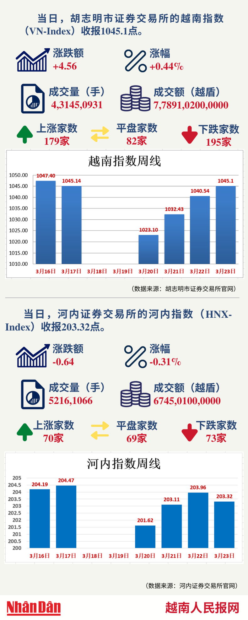 2025年10月22日星期三 20:44 10月22日越南证券市场数据一览 【图表新闻】 当天,胡志明市证券交易所的越南指数(VN-Index)和河内证券交易所的河内指数(HNX-Index)分别收报1678.5点和268.69点。
