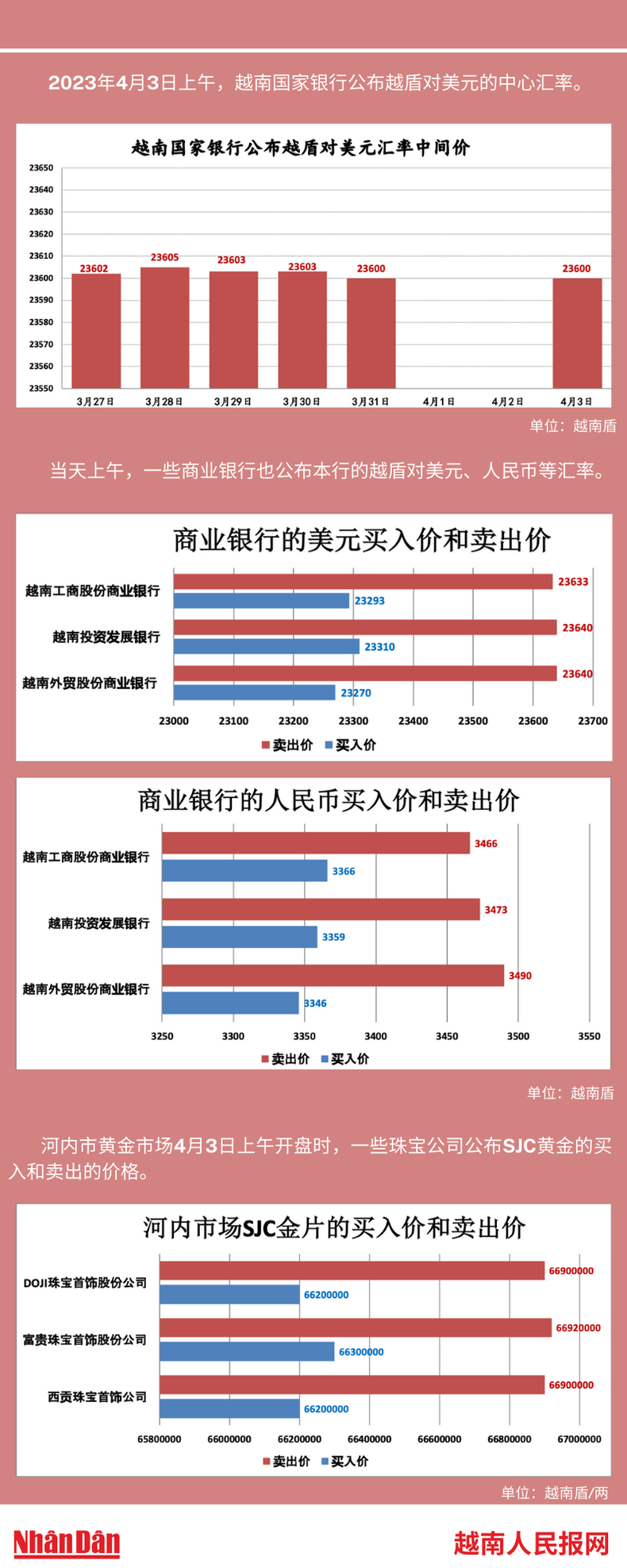 2023年4月3日上午,越南国家银行所公布的越盾对美元的中心汇率为23600。