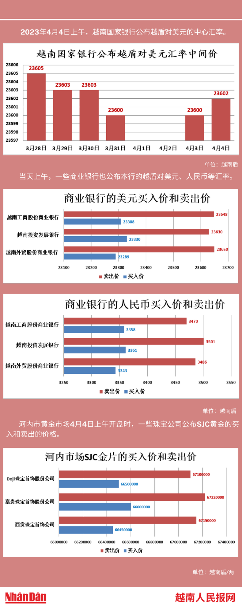 2023年4月4日上午,越南国家银行所公布的越盾对美元的中心汇率为23602。