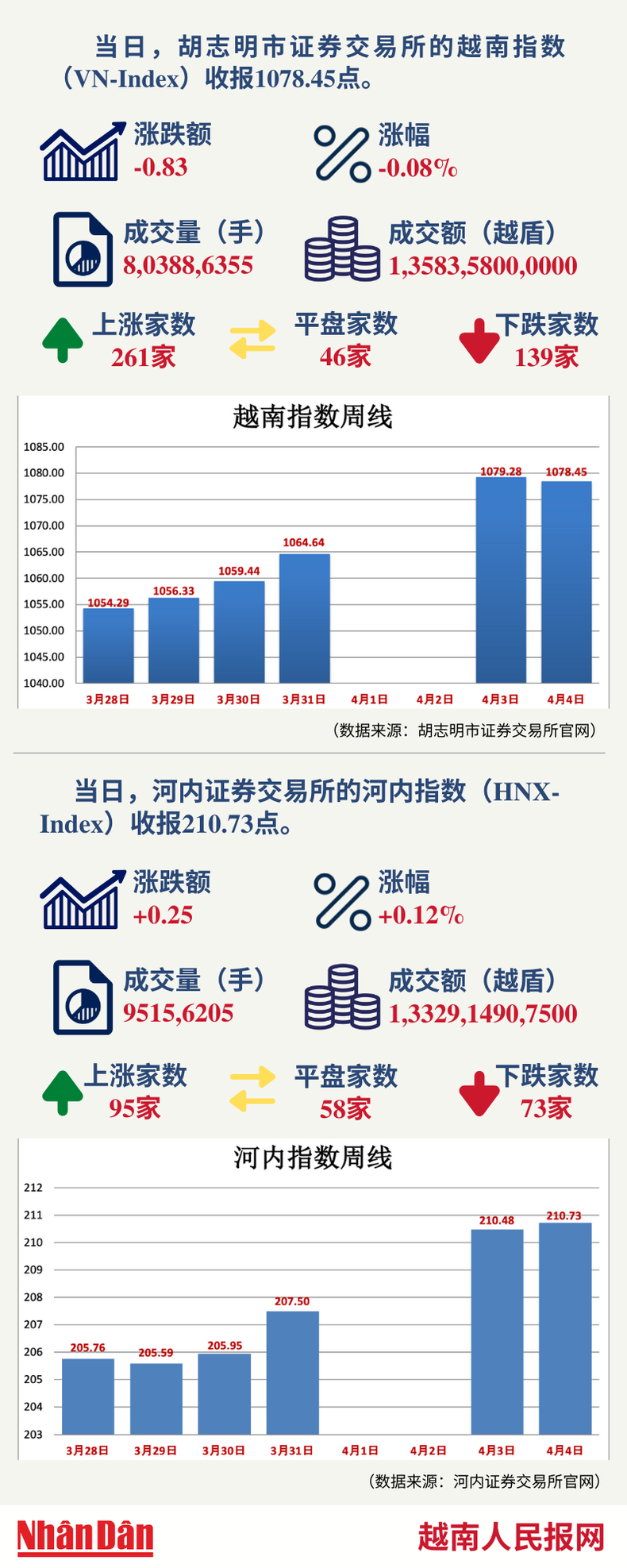 当天,胡志明市证券交易所的越南指数(VN-Index)和河内证券交易所的河内指数(HNX-Index)分别收报1079.28点和210.48点。