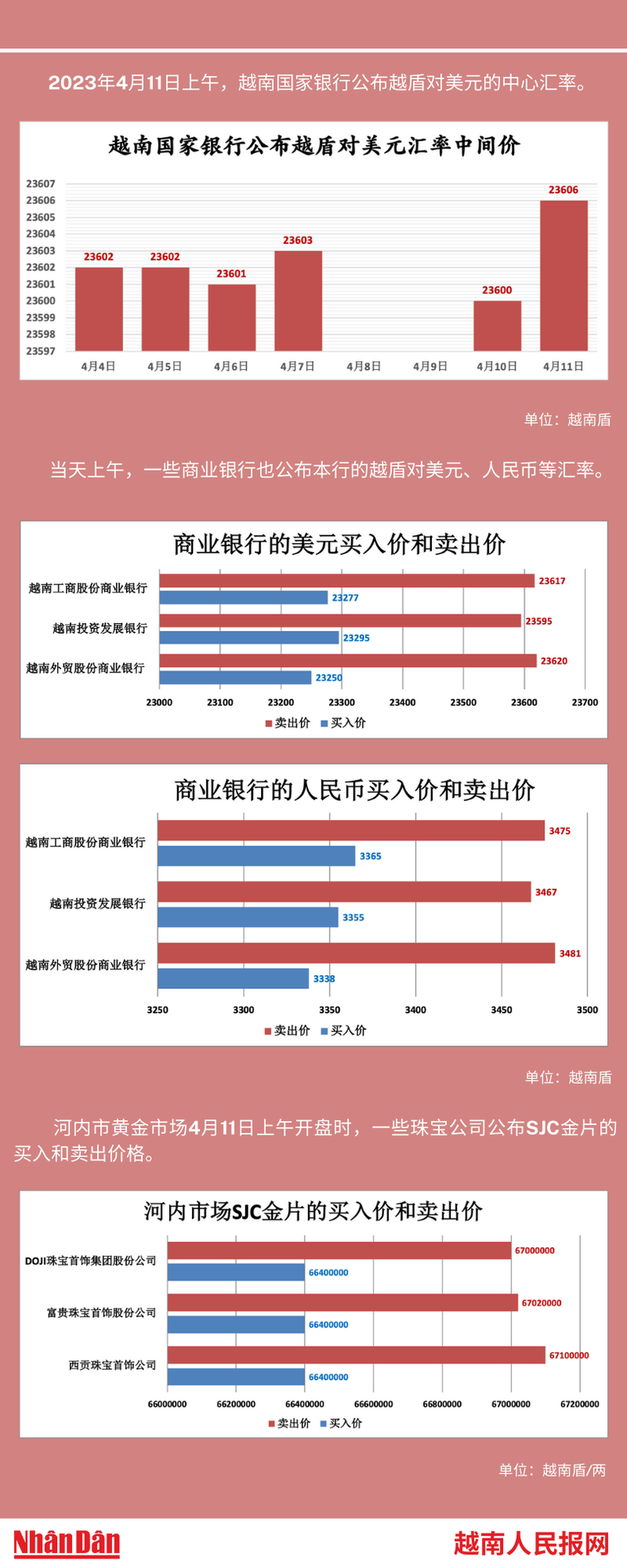2023年4月11日上午,越南国家银行所公布的越盾对美元的中心汇率为23606。