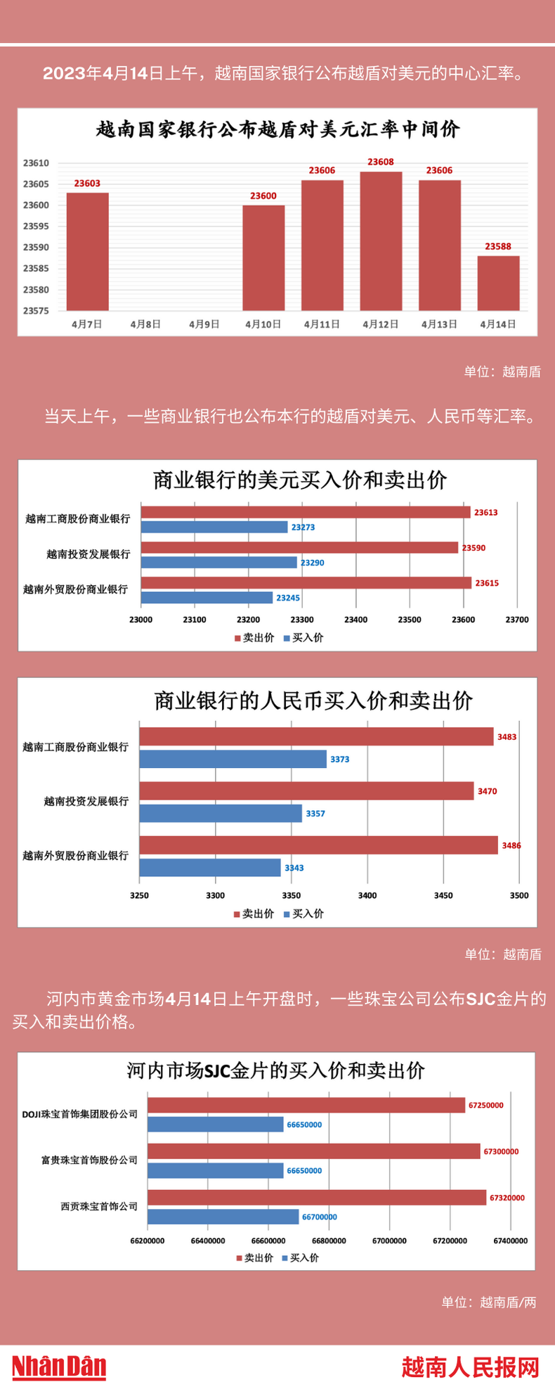 2023年4月14日上午,越南国家银行所公布的越盾对美元的中心汇率为23588。