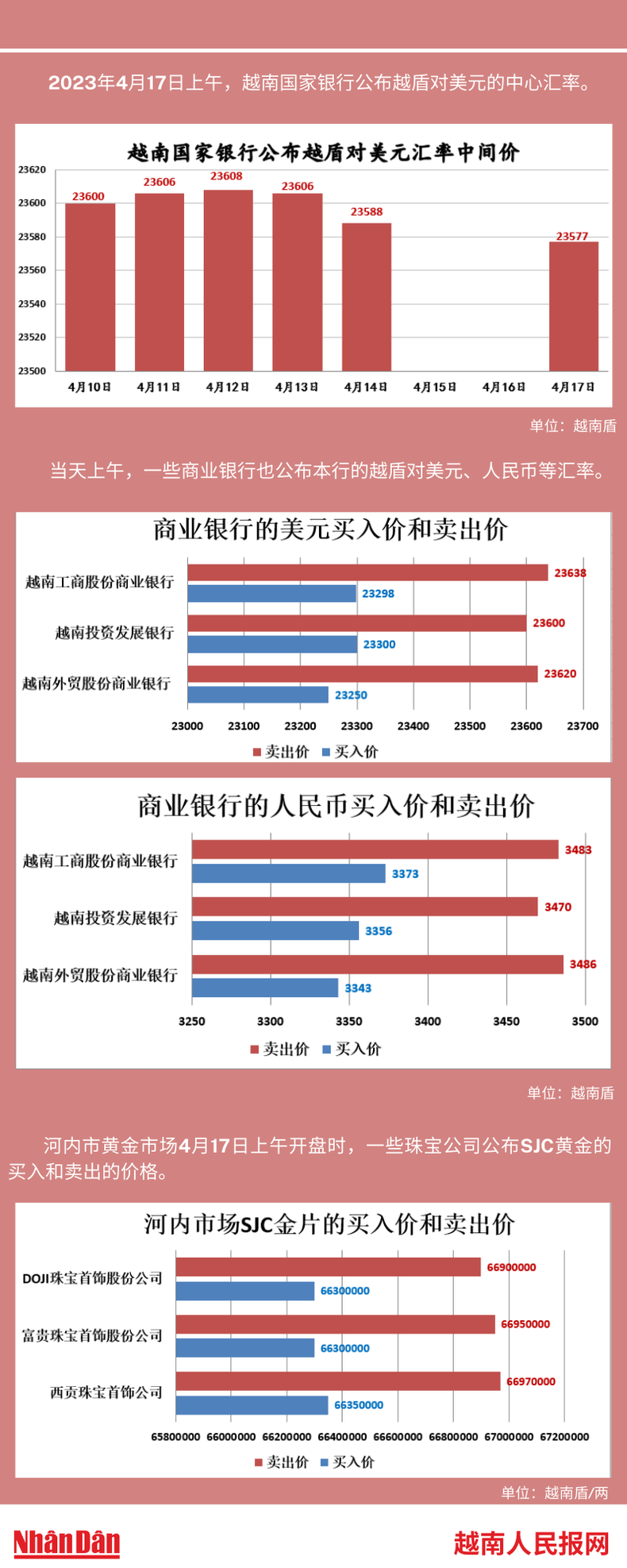 2023年4月17日上午,越南国家银行所公布的越盾对美元的中心汇率为23577。