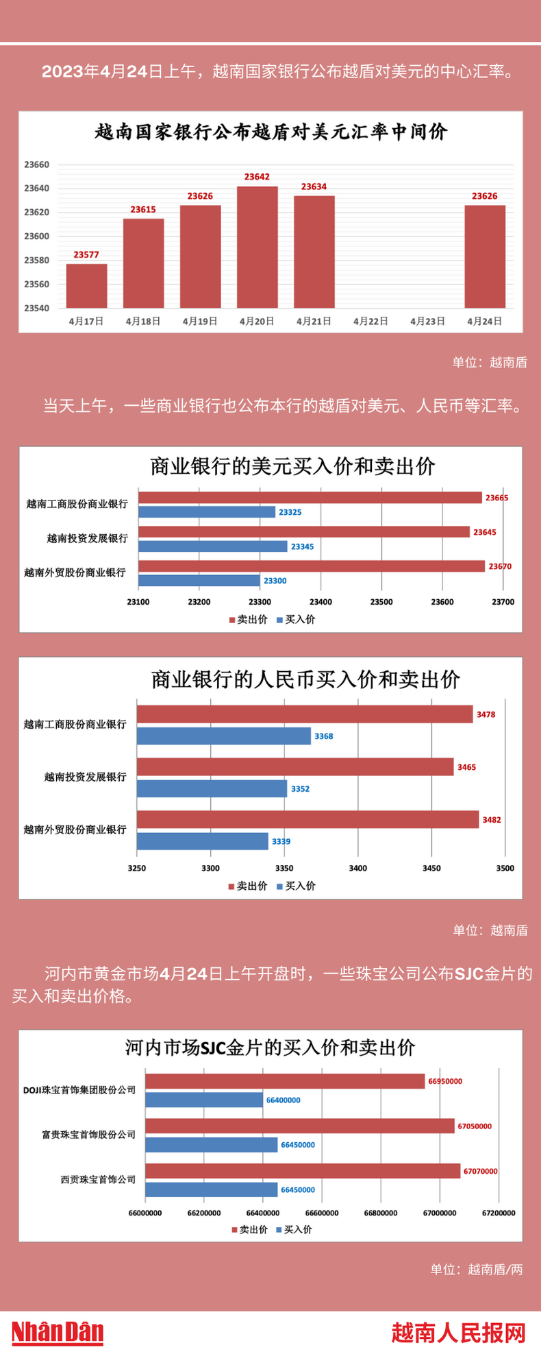 2023年4月24日上午,越南国家银行所公布的越盾对美元的中心汇率为23626。