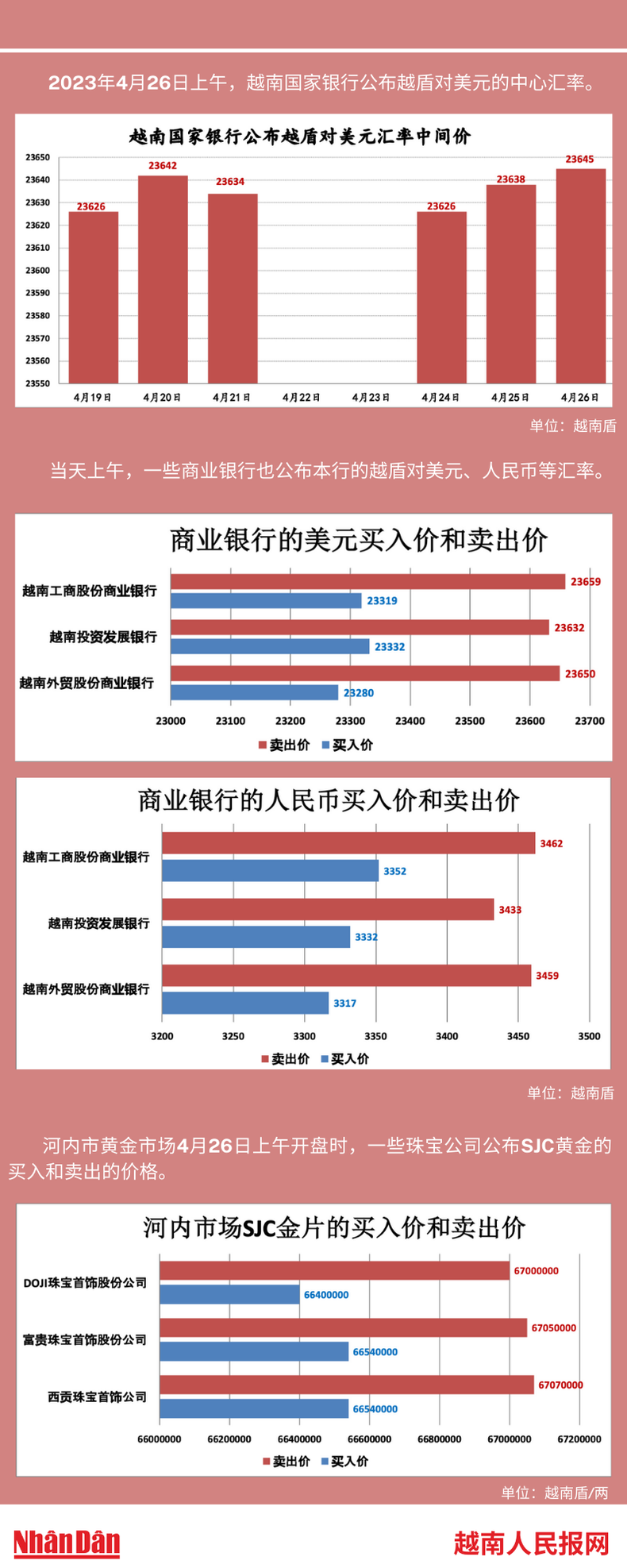 2023年4月26日上午,越南国家银行所公布的越盾对美元的中心汇率为23645。
