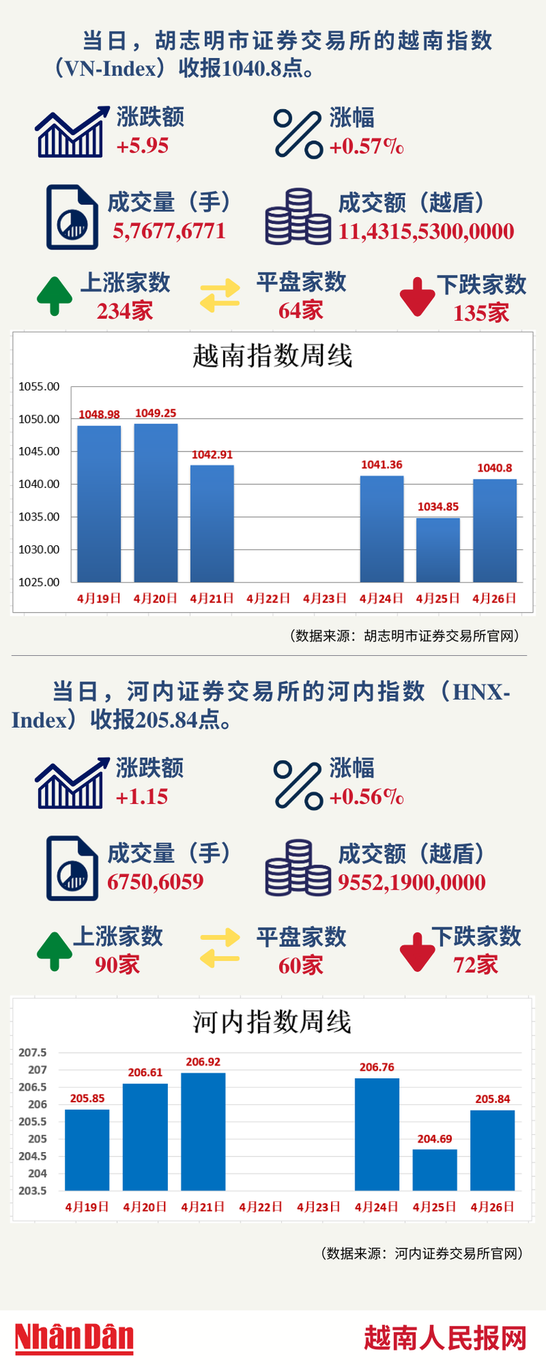 当天,胡志明市证券交易所的越南指数(VN-Index)和河内证券交易所的河内指数(HNX-Index)分别收报1040.8点和205.84点。
