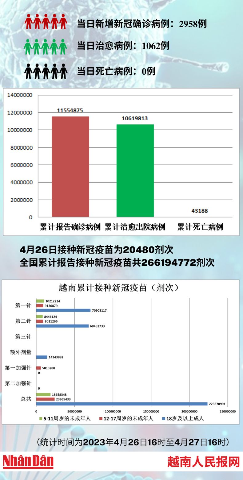 据越南卫生部4月27日下午公布的信息,当天越南新增新冠肺炎确诊病例2958例,治愈病例1062例,无新增死亡病例。