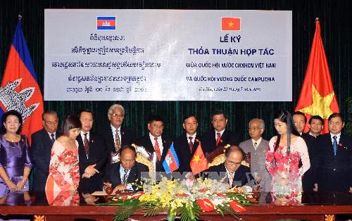 国会主席阮生雄同柬埔寨王国国会主席韩桑林出席两国国会合作文件的签字仪式。(图: 阮民 摄)