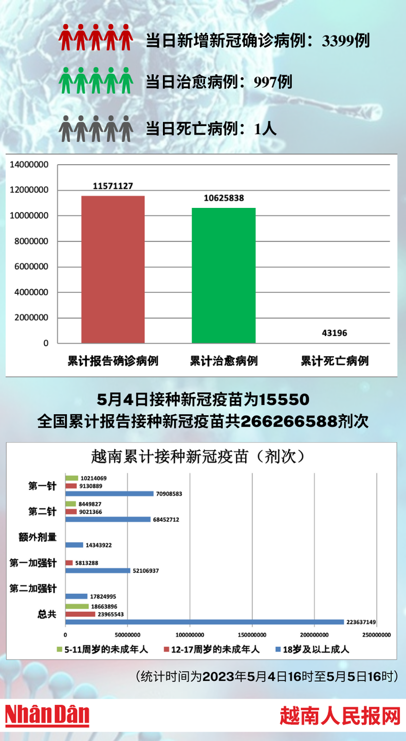 据越南卫生部5月5日下午公布的信息,当天越南新增新冠肺炎确诊病例为3399例,治愈病例997,死亡病例1例。