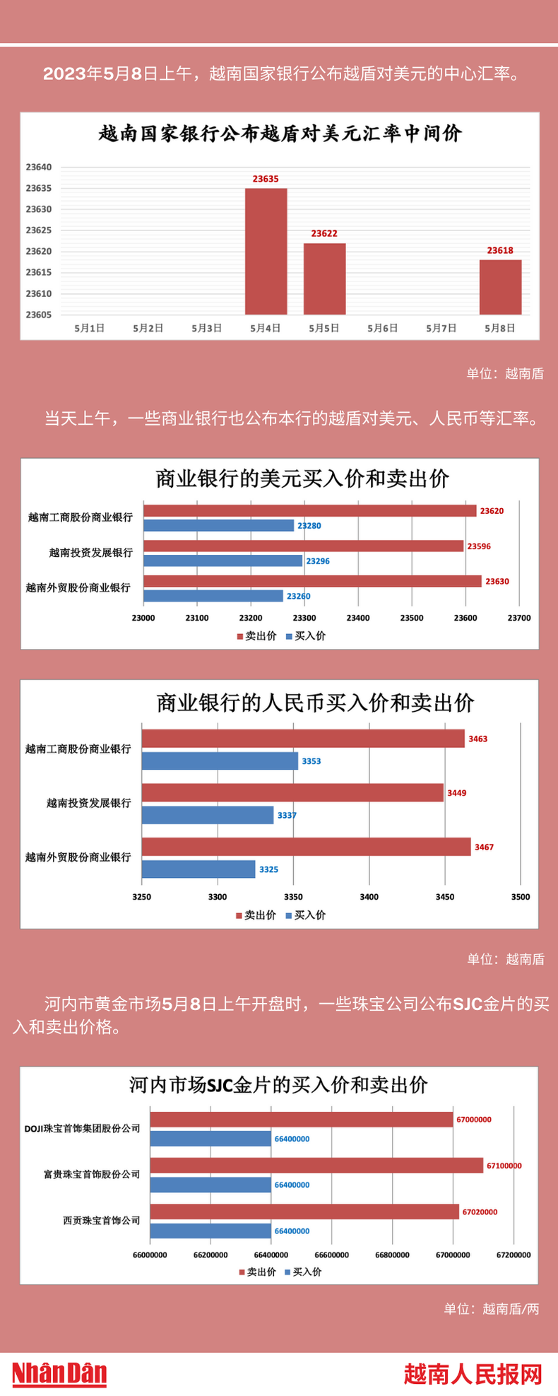 2023年5月8日上午,越南国家银行所公布的越盾对美元的中心汇率为23618。