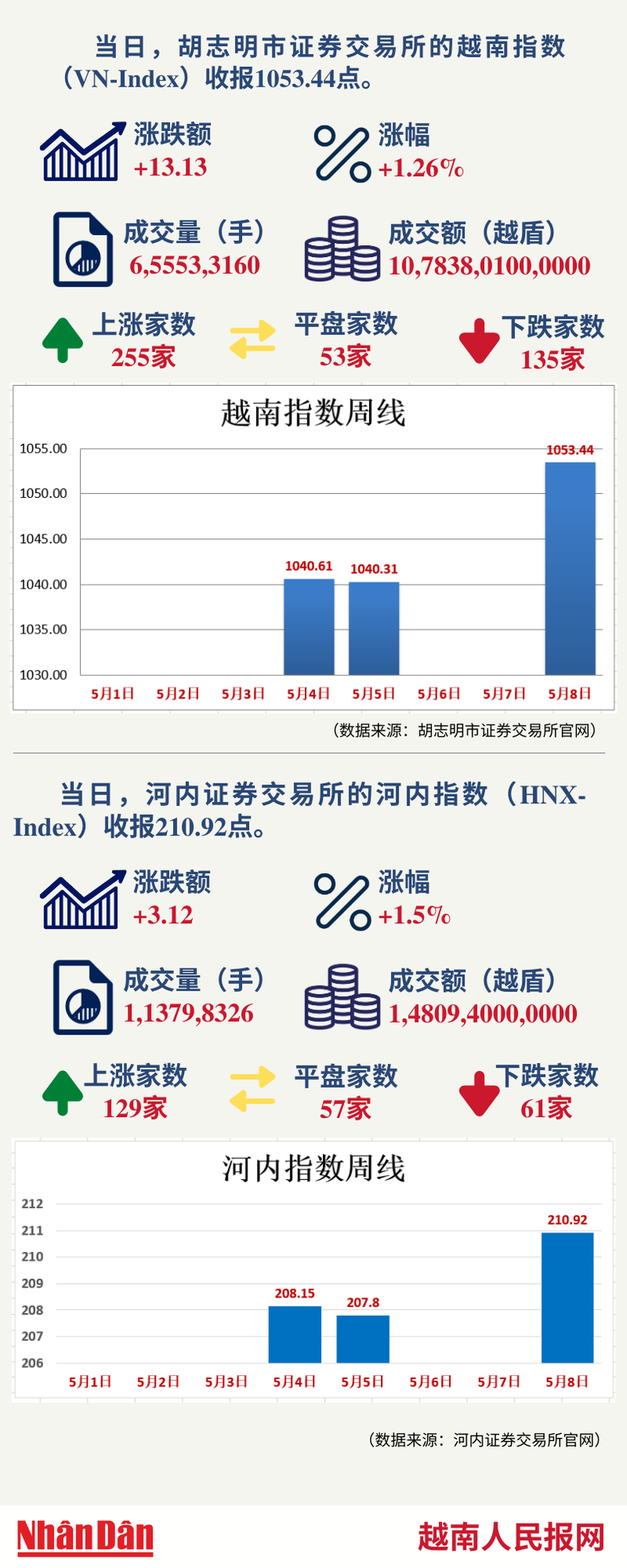 当天,胡志明市证券交易所的越南指数(VN-Index)和河内证券交易所的河内指数(HNX-Index)分别收报1053.44点和210.92点。