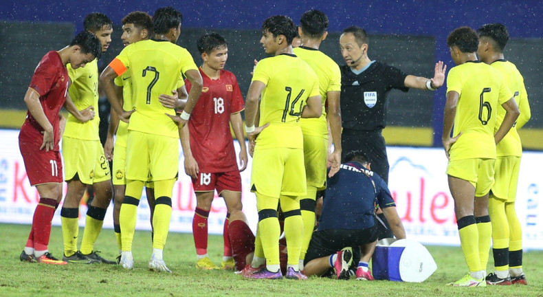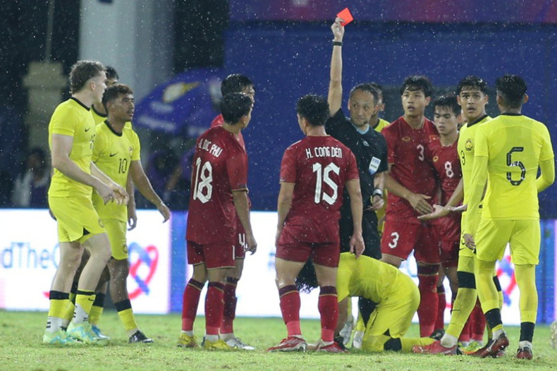第80分钟,马来西亚U22队禁区内发生争执后,青闲遭Safwan肘击。 裁判出示红牌取消刚刚替补上场球员的比赛资格。3分钟后,马来西亚U22队Najmudin在反击中对一名越南U22球员犯规被红牌罚下。