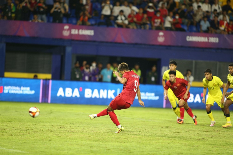 比赛进行到5分钟,明仲禁区外射门,马来西亚球员Harith在禁区内用手触球,裁判犹豫片刻后吹罚点球。文松第一脚射门被门将扑出。不过,效力于河内FC的前锋文准立即迎上去一脚补射,越南U22队1-0领先。