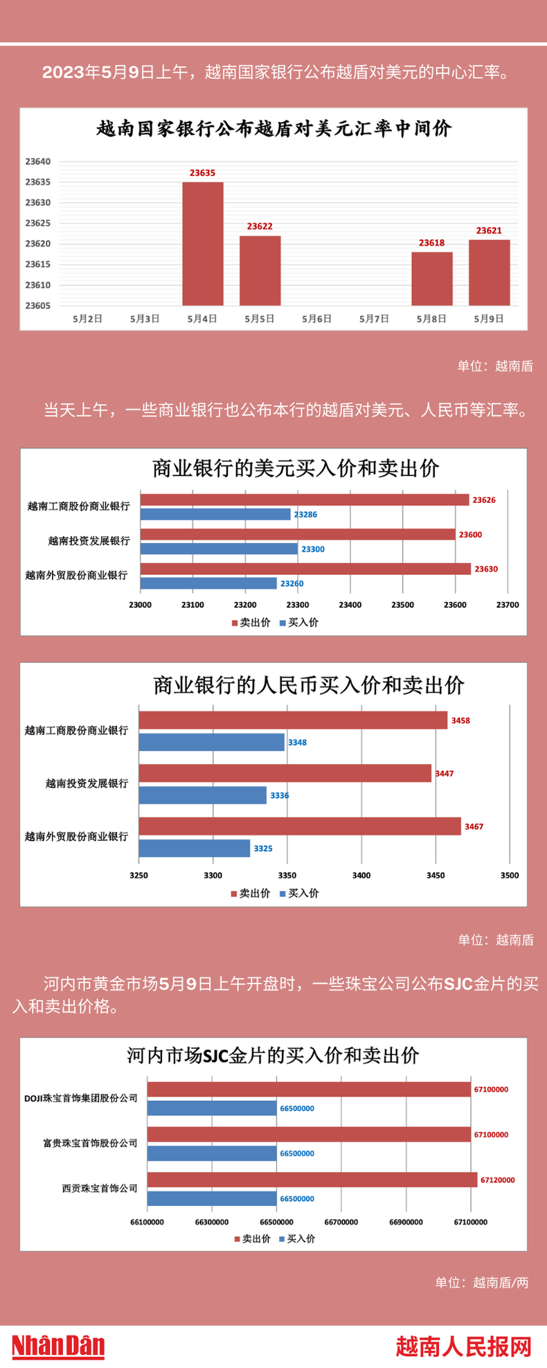 2023年5月9日上午,越南国家银行所公布的越盾对美元的中心汇率为23621。
