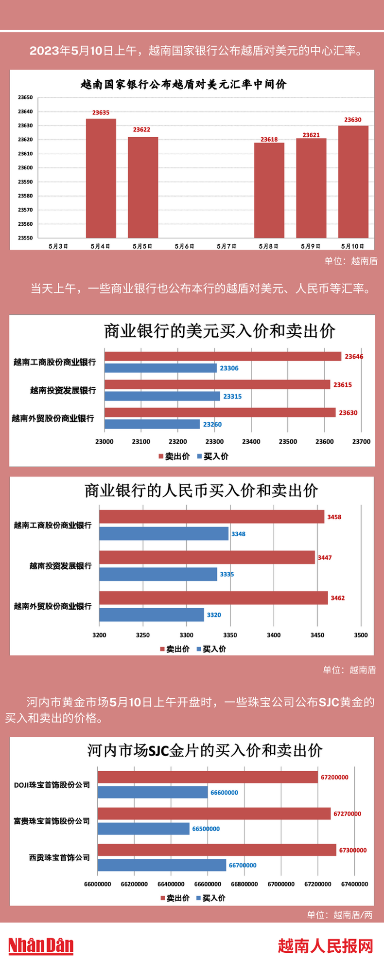 2023年5月10日上午,越南国家银行所公布的越盾对美元的中心汇率为23630。