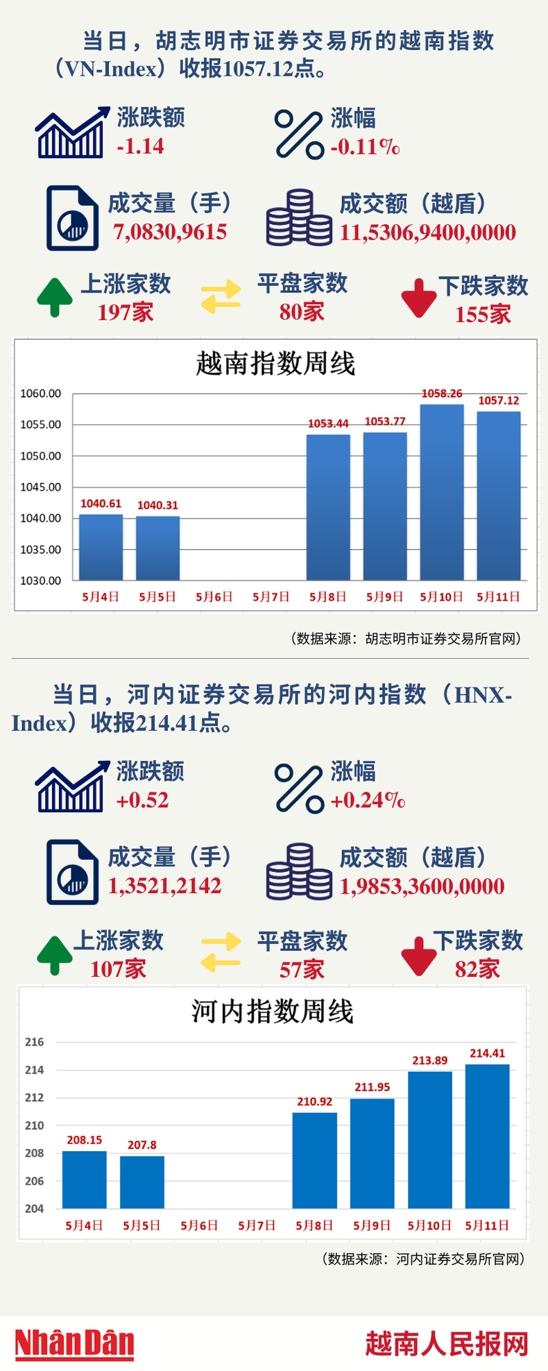 当天,胡志明市证券交易所的越南指数(VN-Index)和河内证券交易所的河内指数(HNX-Index)分别收报1057.12点和214.41点。
