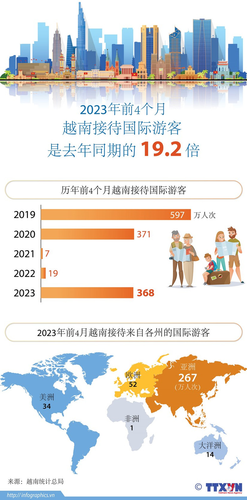 2023年前4个月越南接待国际游客是去年同期的19.2倍【图表新闻】
