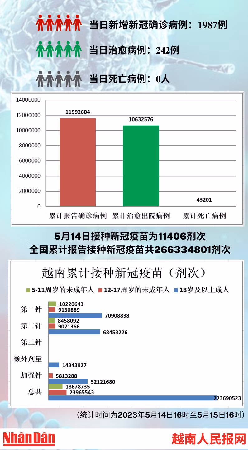 据越南卫生部5月15日下午公布的信息,当天越南新增新冠肺炎确诊病例为1987例,治愈病例242,无死亡病例。