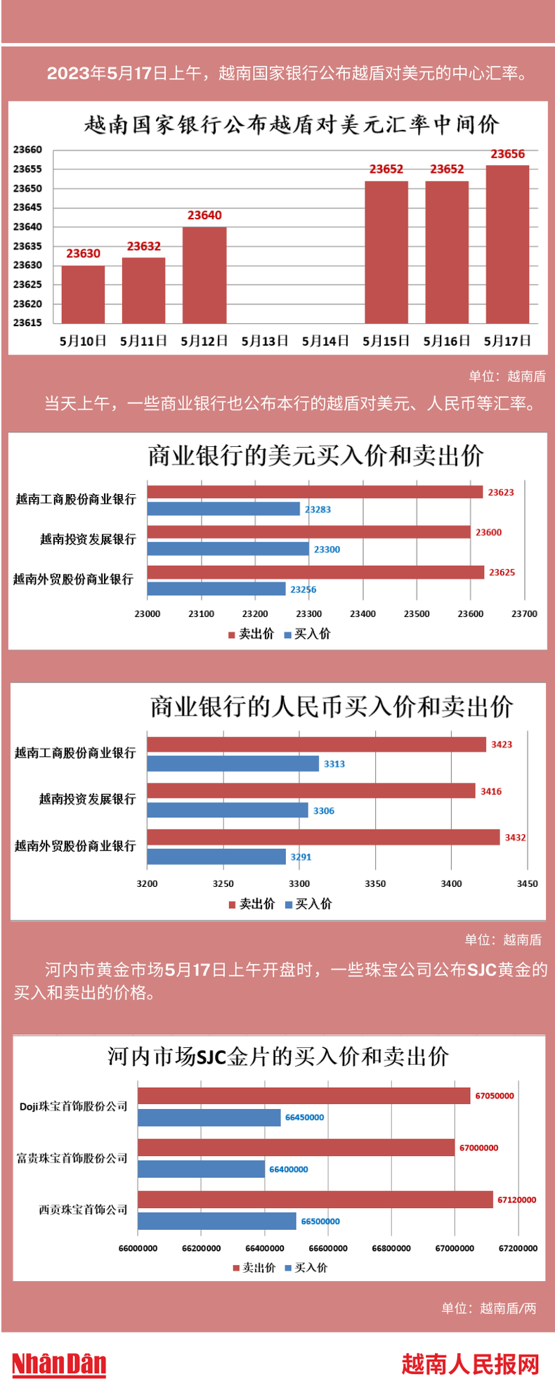 2023年5月17日上午,越南国家银行所公布的越盾对美元的中心汇率为23656。