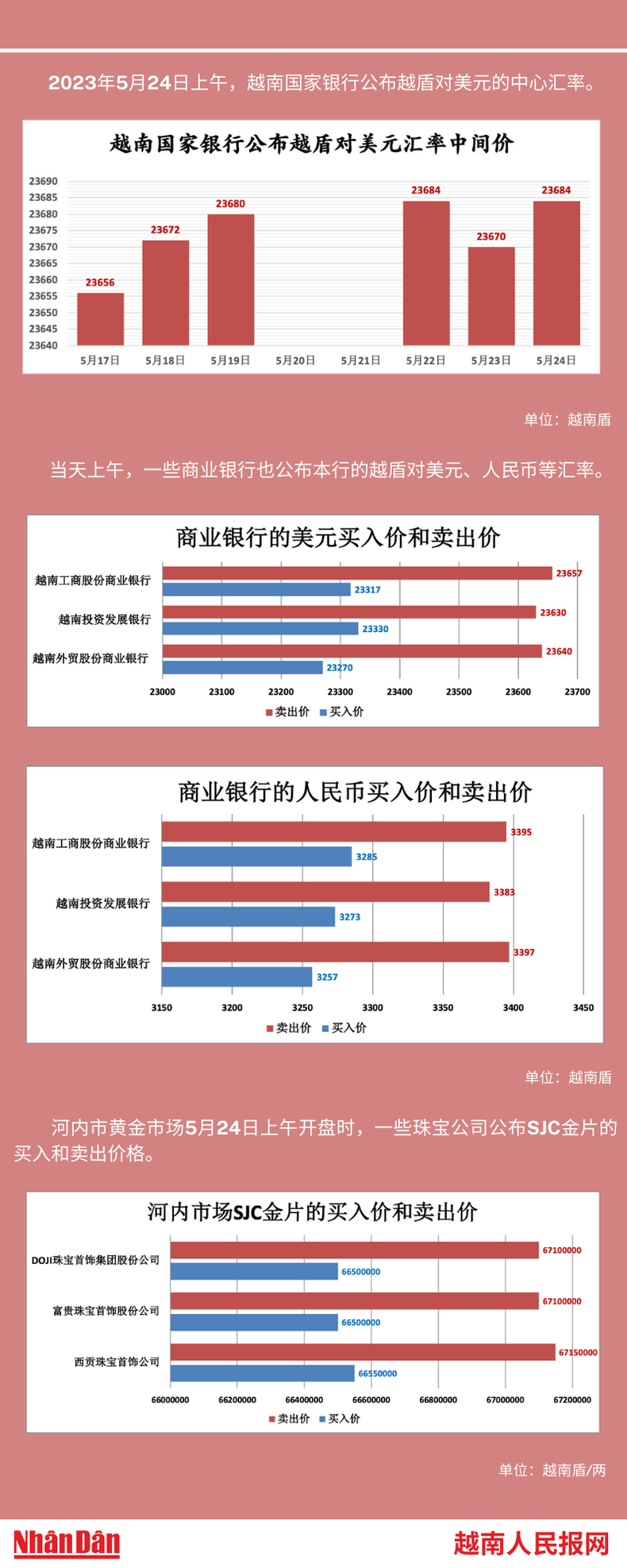 2023年5月24日上午,越南国家银行所公布的越盾对美元的中心汇率为23684。