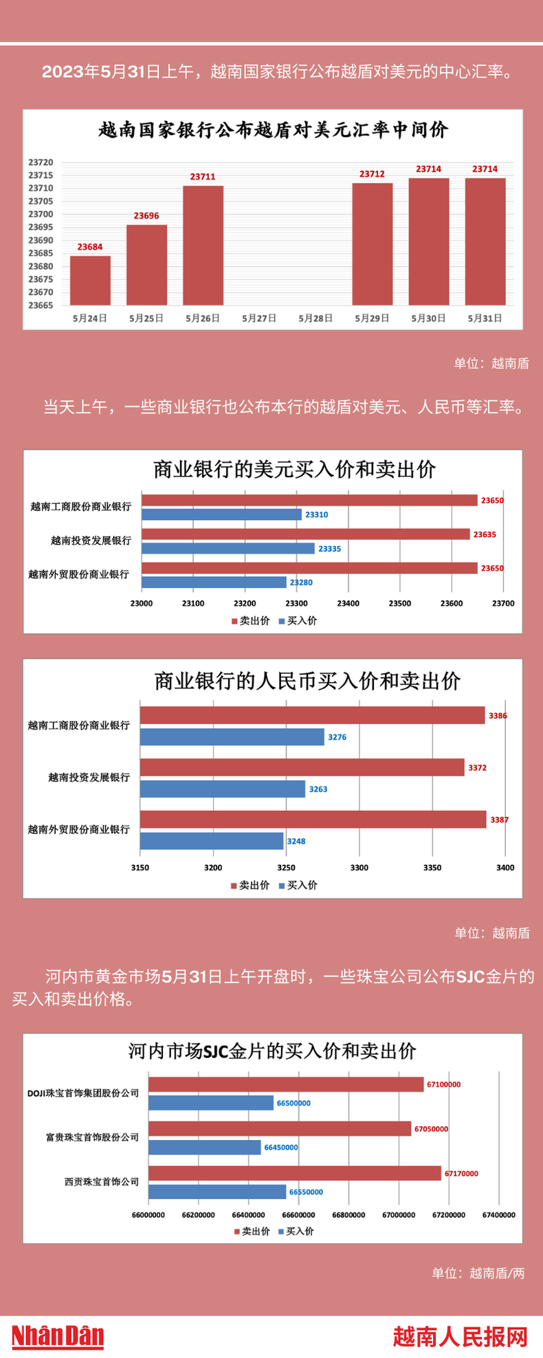 2023年5月31日上午,越南国家银行所公布的越盾对美元的中心汇率为23714。