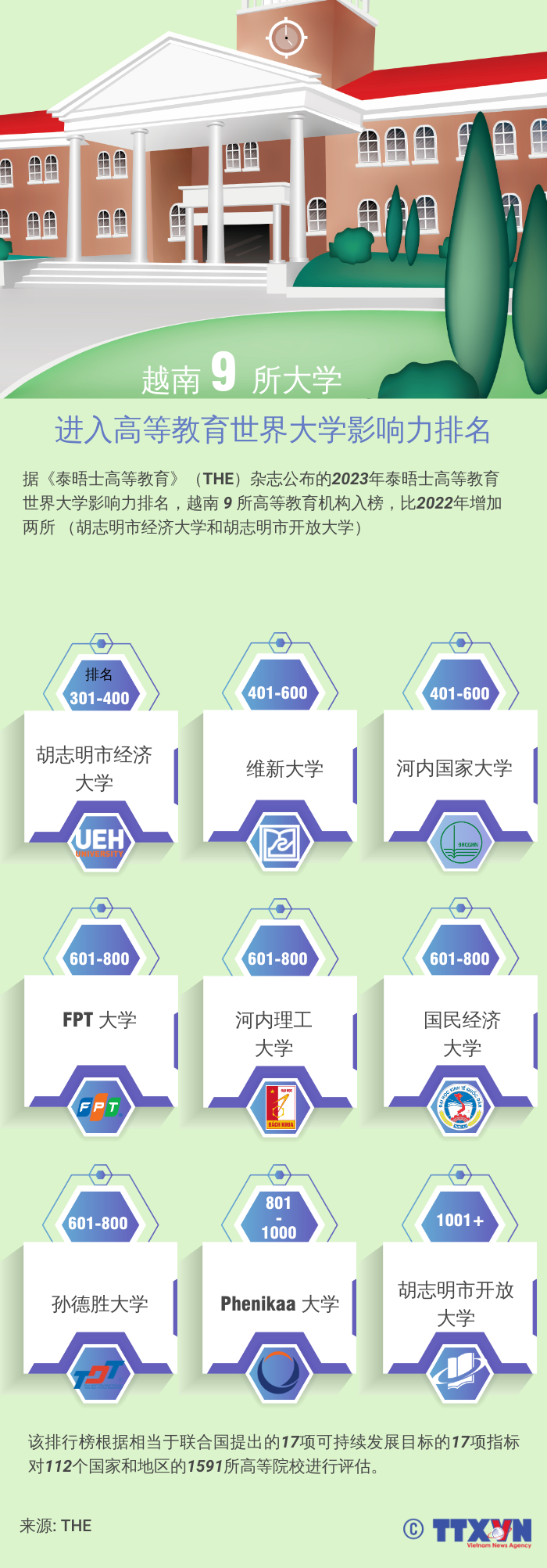 据《泰晤士高等教育》(THE)杂志公布的2023年泰晤士高等教育世界大学影响力排名,越南9所高等教育机构入榜,比2022年增加两所 (胡志明市经济大学和胡志明市开放大学)。