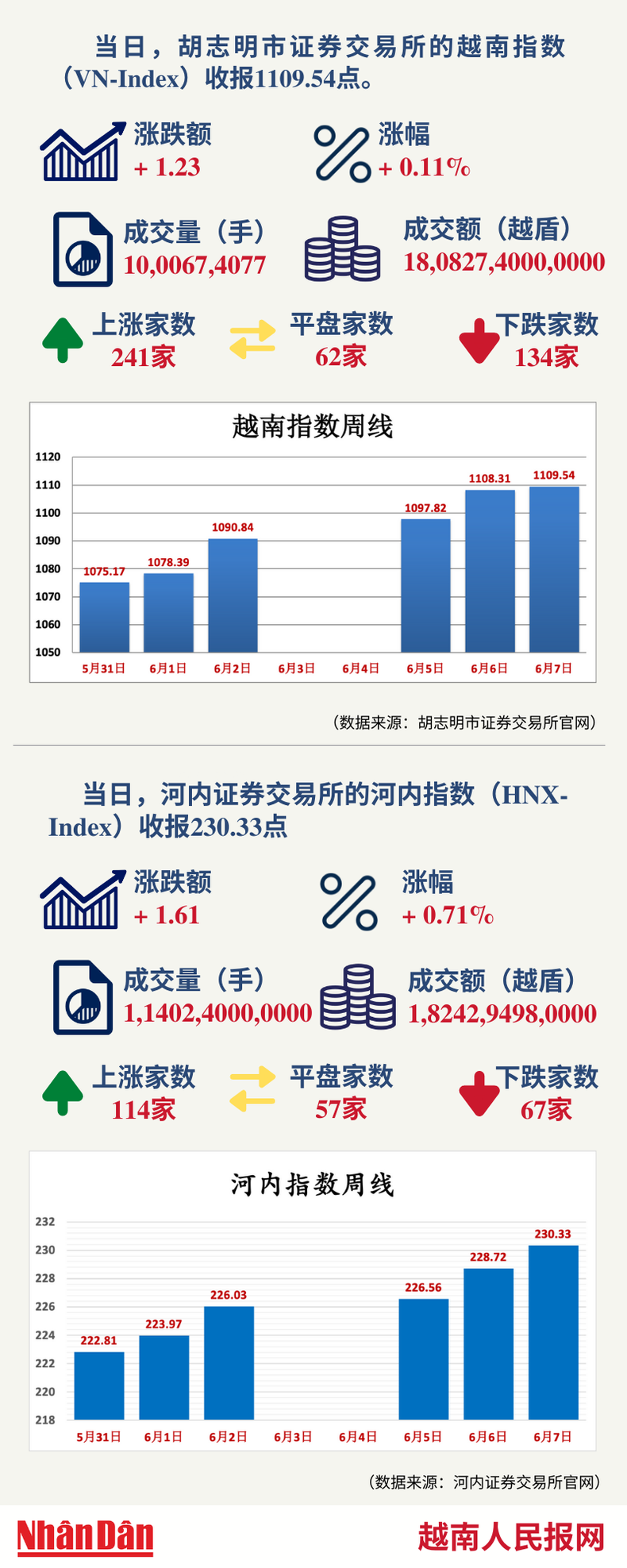 当天,胡志明市证券交易所的越南指数(VN-Index)和河内证券交易所的河内指数(HNX-Index)分别收报1109.54点和230.33点。