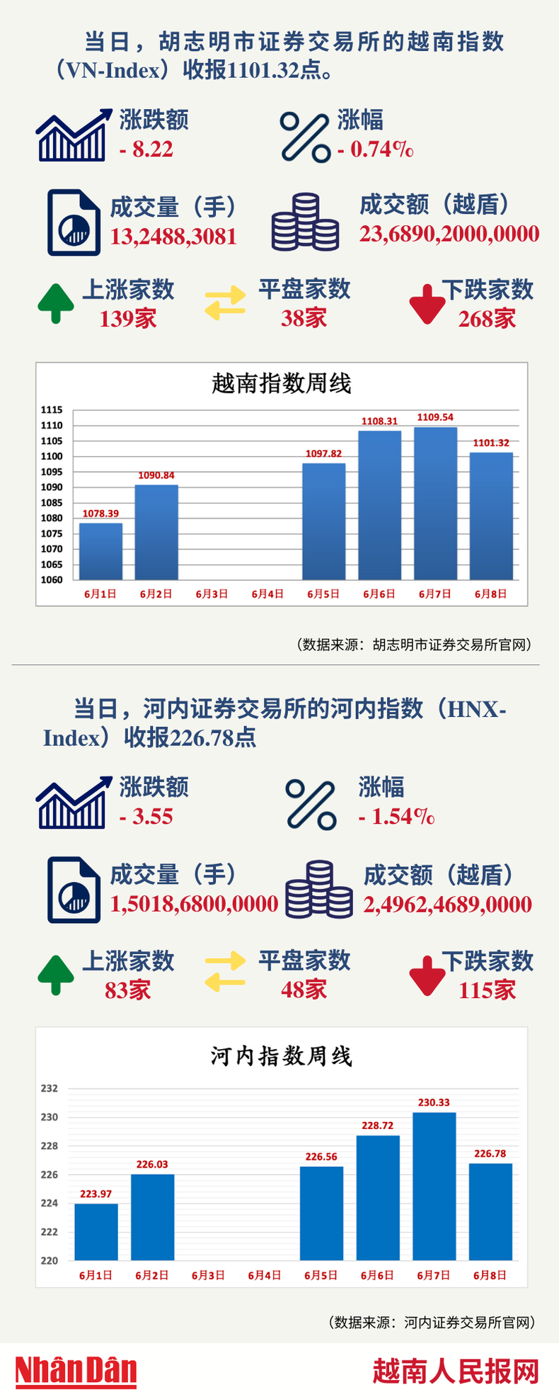 当天,胡志明市证券交易所的越南指数(VN-Index)和河内证券交易所的河内指数(HNX-Index)分别收报1101.32点和226.78点。