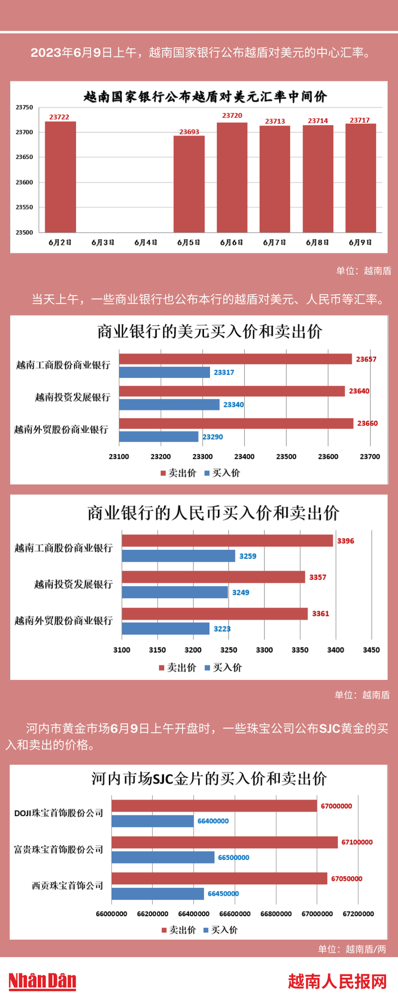2023年6月9日上午,越南国家银行所公布的越盾对美元的中心汇率为23717。