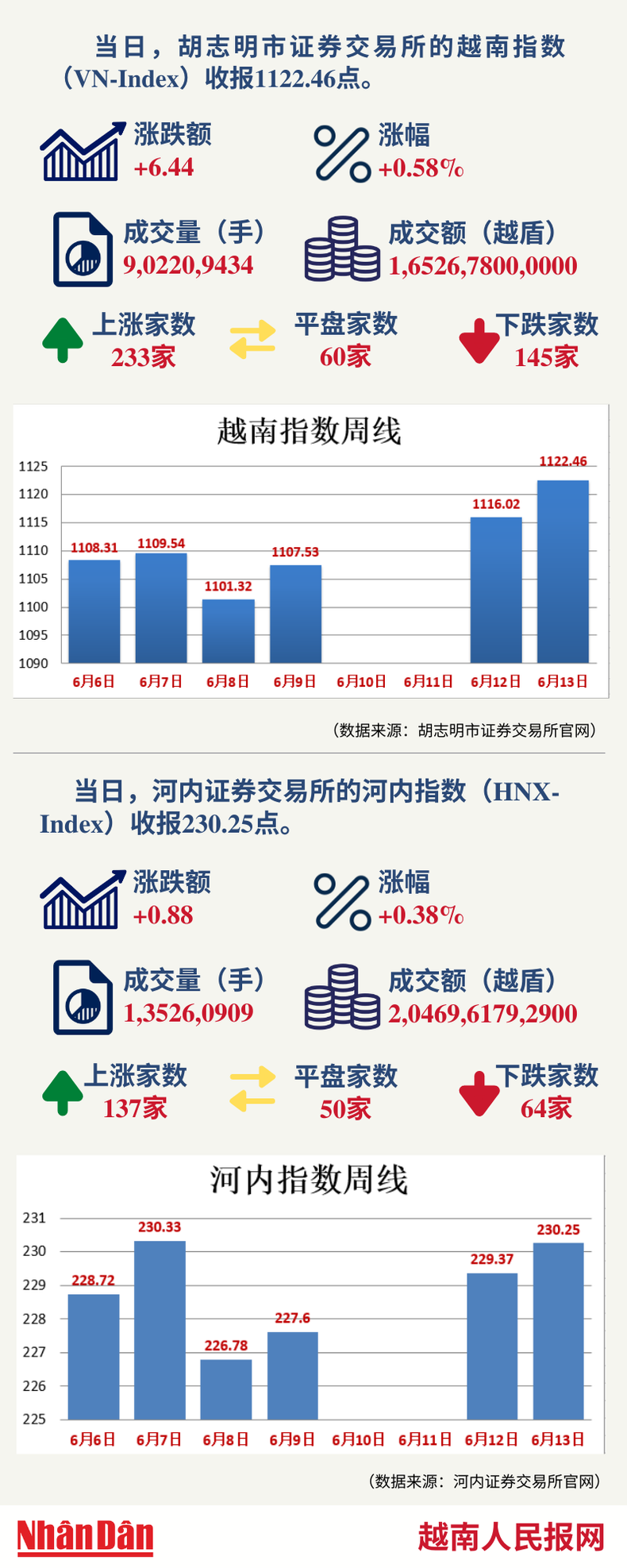 当天,胡志明市证券交易所的越南指数(VN-Index)和河内证券交易所的河内指数(HNX-Index)分别收报1122.46点和230.25点。