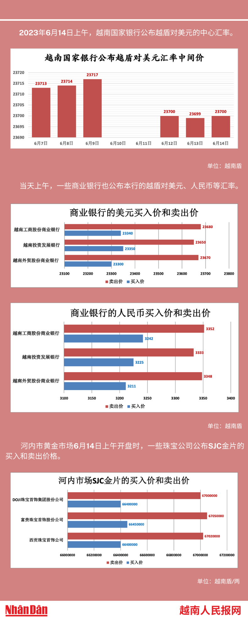 2023年6月14日上午,越南国家银行所公布的越盾对美元的中心汇率为23700。
